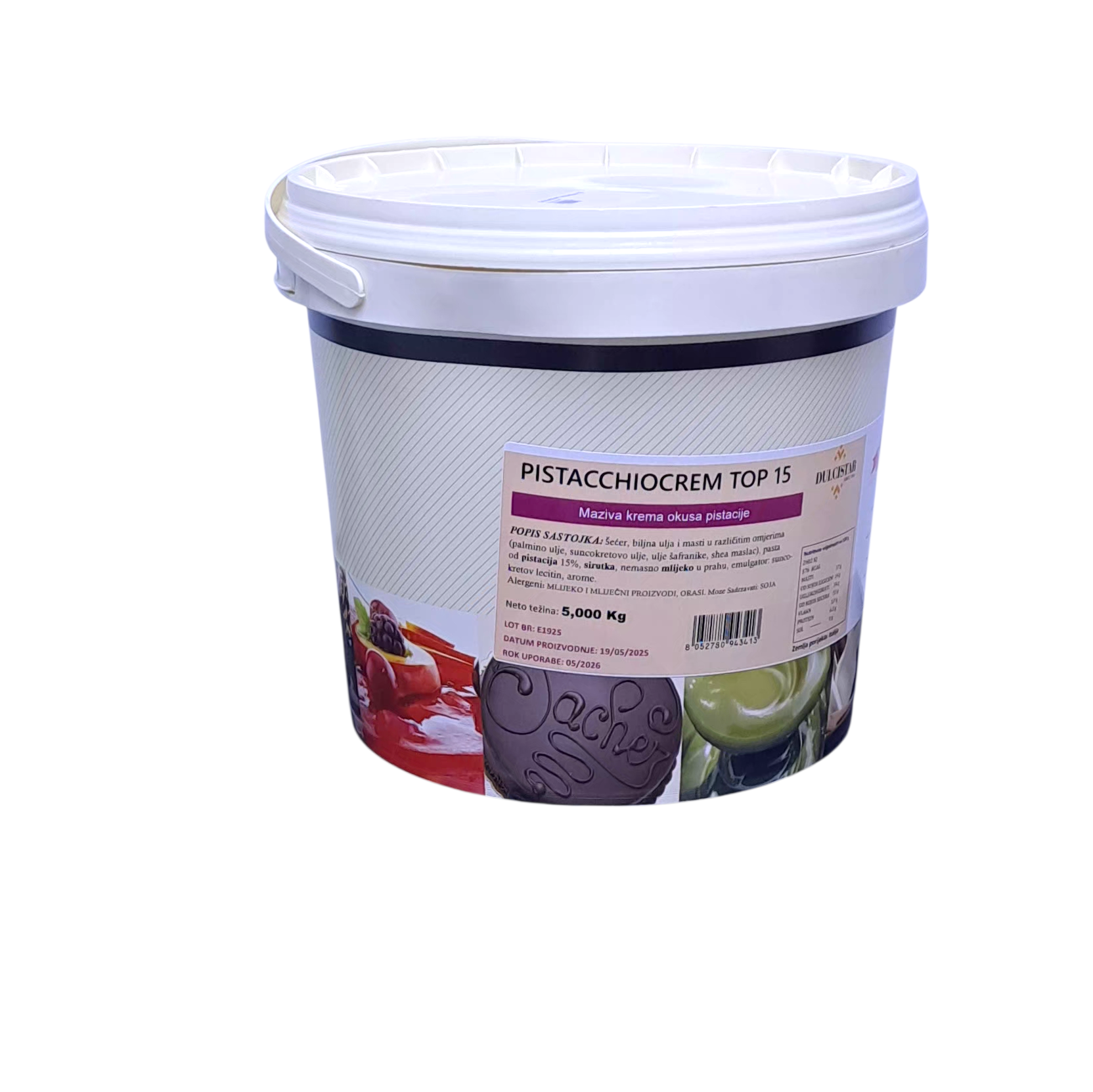 Sa Dulcistar Pistacija TOP Kremom 15 % (5 kg), podignite svoje dezerte na nivo istinskih remek-djela uz neodoljiv ukus i miris pečenih pistacija. Ova visokokvalitetna, gotova krema dizajnirana je da pruži profesionalan dodir vašim tortama, rolatima i sitnim kolačima, osiguravajući savršenu teksturu i prepoznatljivu zelenu boju.